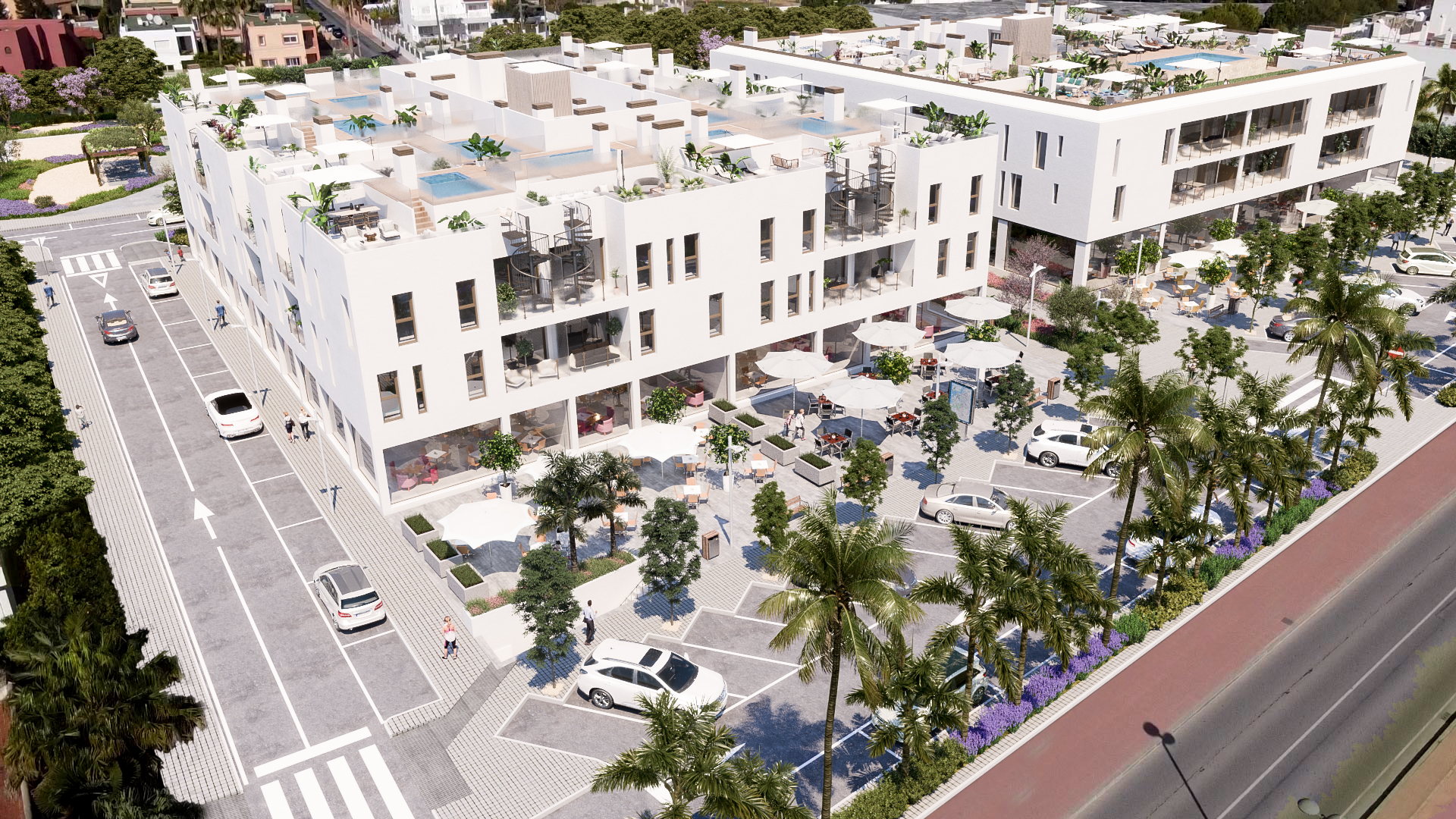 - Cubierta plana transitable, formada por hormigón aligerado en formación de pendientes, lamina impermeable, aislamiento térmico y acabado con materiales antideslizantes.